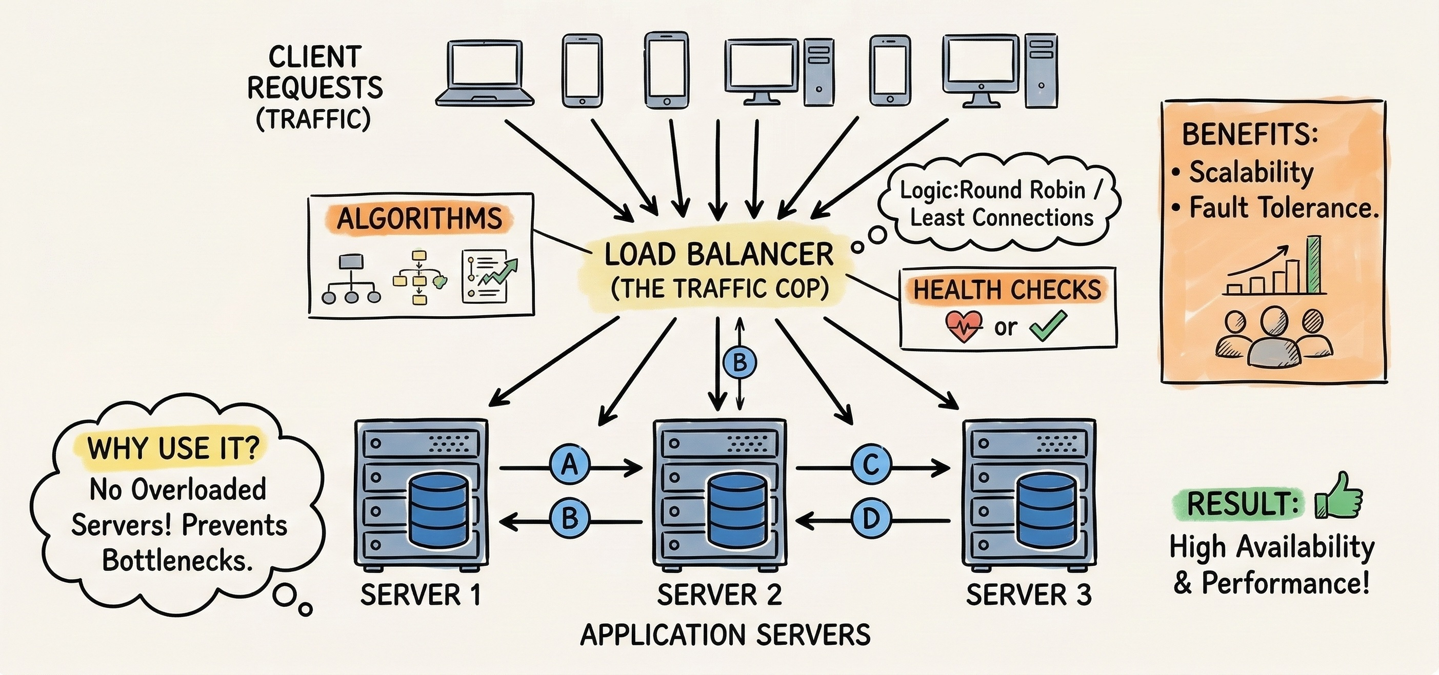 If a server stops responding to these pings, the load balancer automatically stops sending it traffic. It routes all new requests to the remaining healthy servers until the broken machine is repaired.