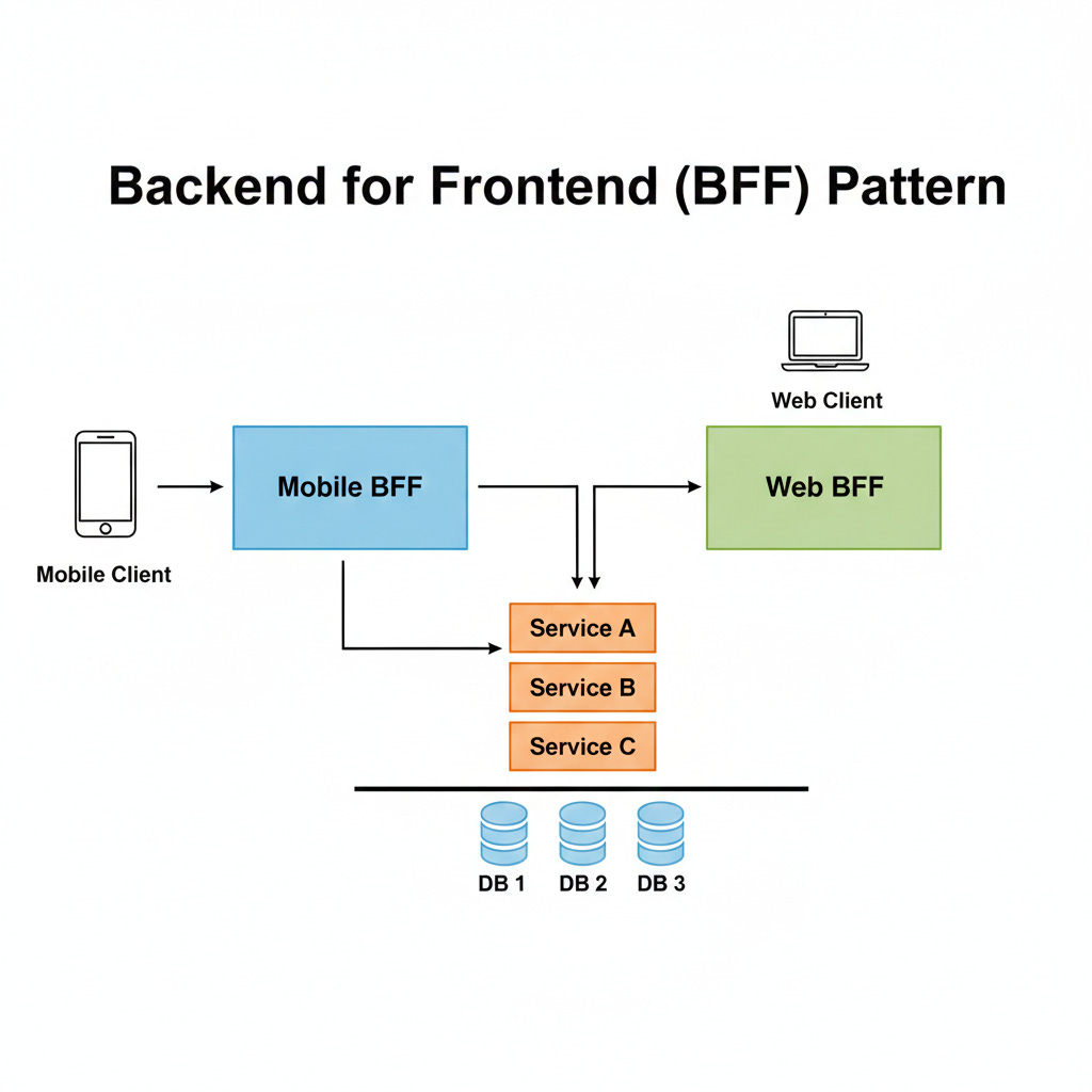 The Backend for Frontend (BFF) pattern suggests creating a specific backend service for each frontend. The mobile app talks to the “Mobile BFF.” This service optimizes the data specifically for the mobile interface, stripping out unnecessary fields. The web app talks to the “Web BFF,” which aggregates more detailed data for the desktop view.