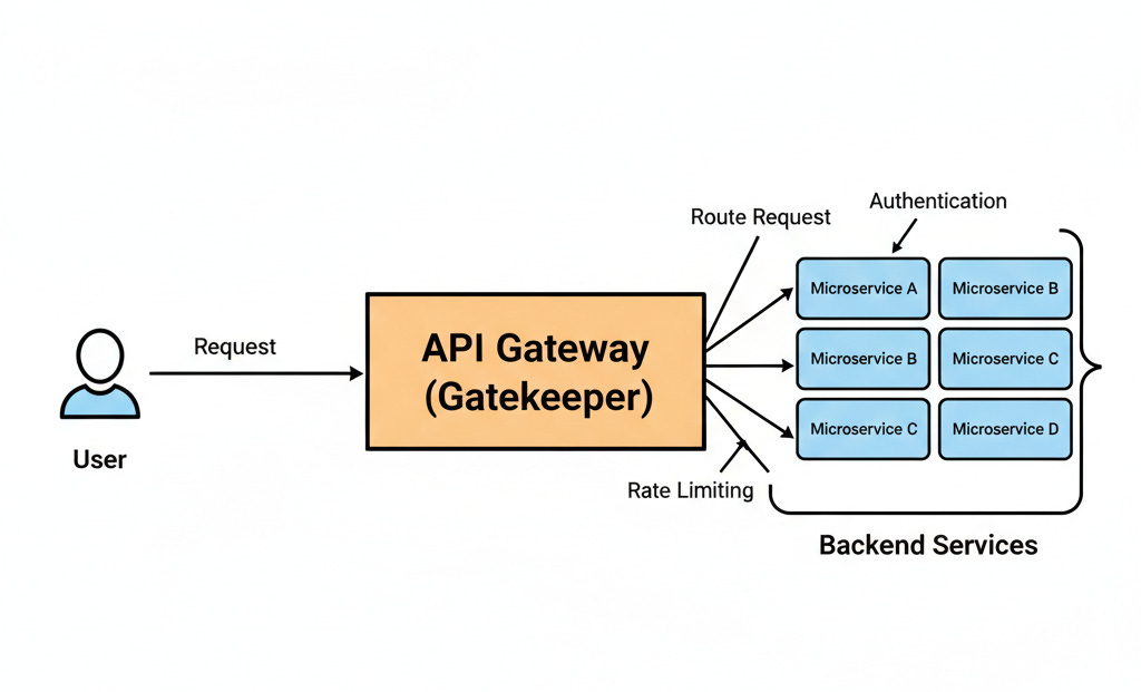 The Gateway looks at the request and routes it to the correct internal service. It also handles cross-cutting concerns: it checks if the user is authenticated, limits how many requests a user can make, and handles SSL termination.