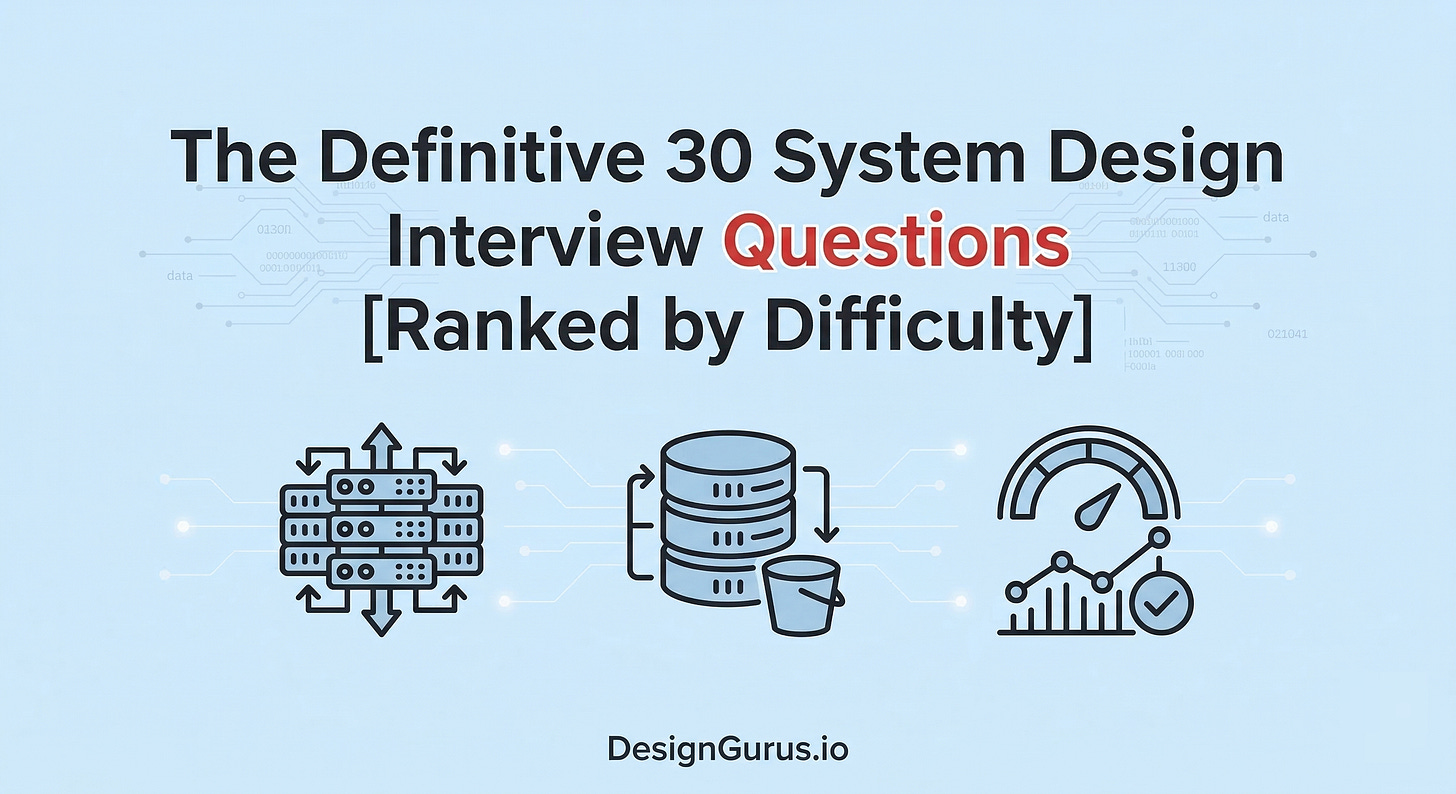 30 system design interview questions ranked by difficulty from beginner to staff level. Each question includes key concepts tested and why it's asked — covering URL shorteners to distributed locking.