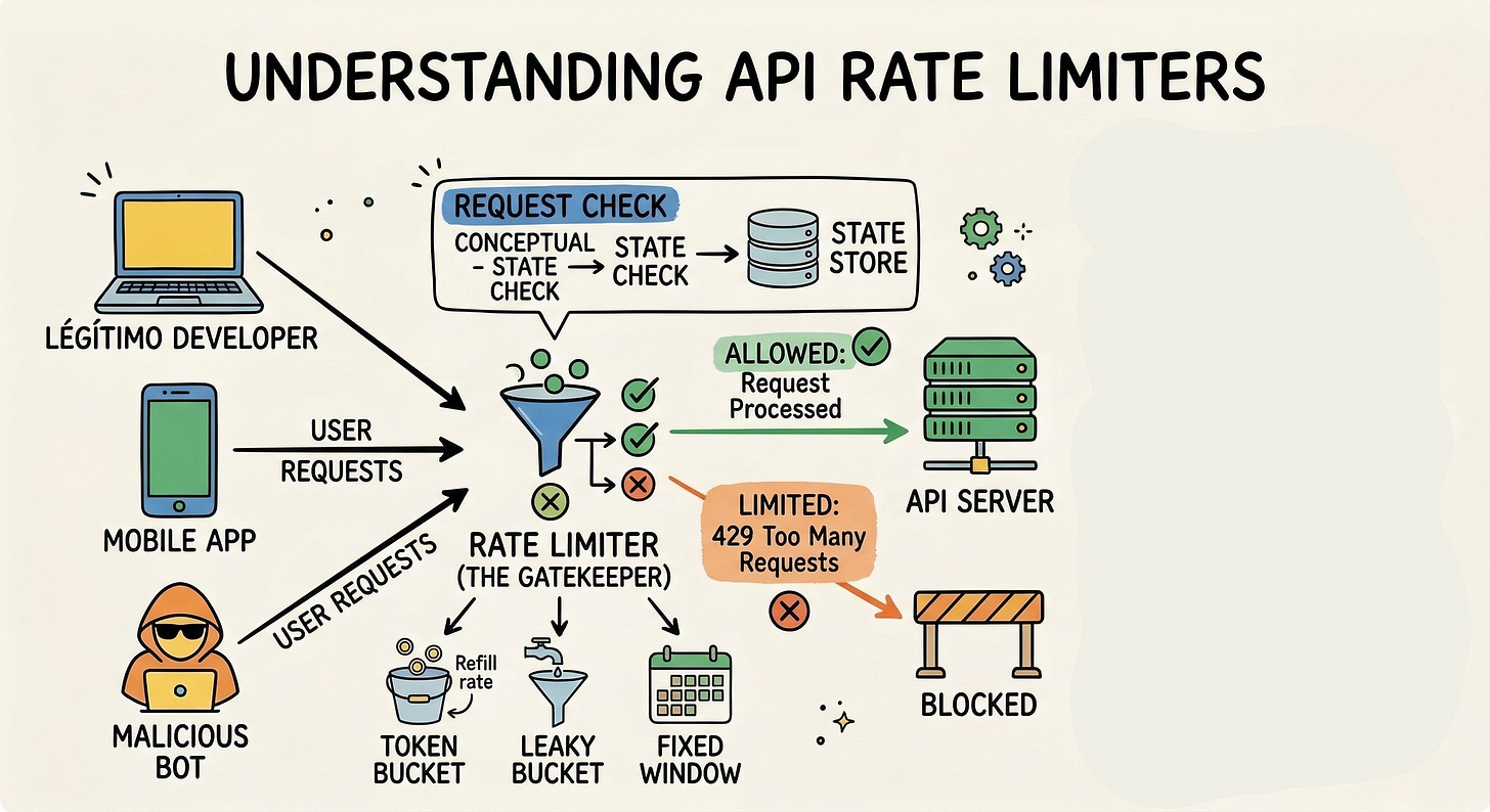 Key concepts tested: Token bucket, leaky bucket, sliding window, and fixed window counter algorithms; Redis for distributed state; HTTP 429 responses; rate limiting at different layers (client, API gateway, application); race conditions in distributed environments.