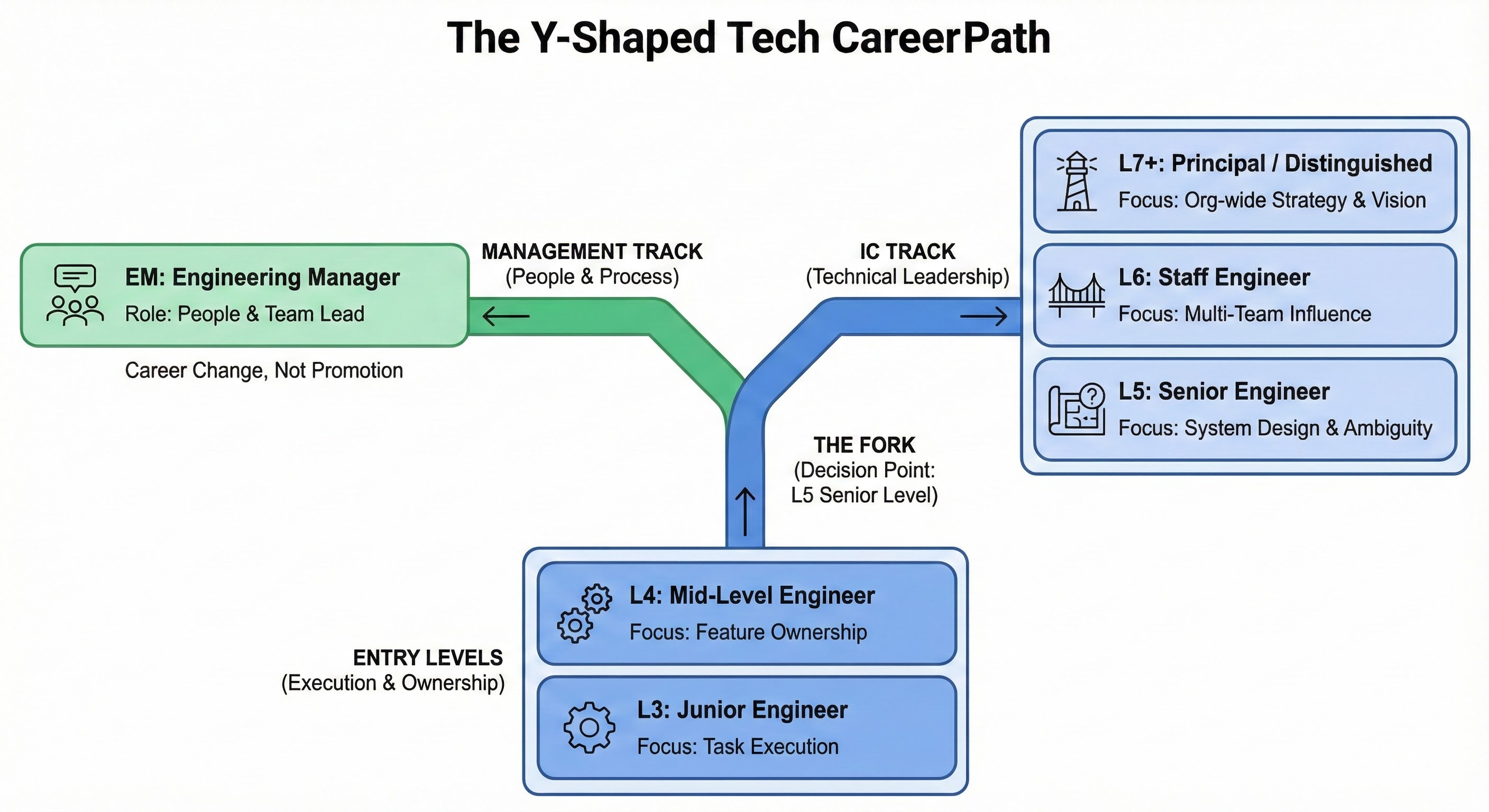 In Big Tech, it works differently. They use something called the Dual Track or the Y-Shaped Path.