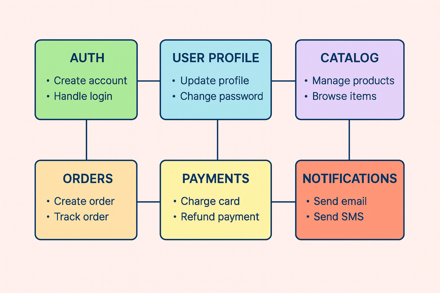 Examples are: Auth, User Profile, Catalog, Orders, Payments, Notifications.