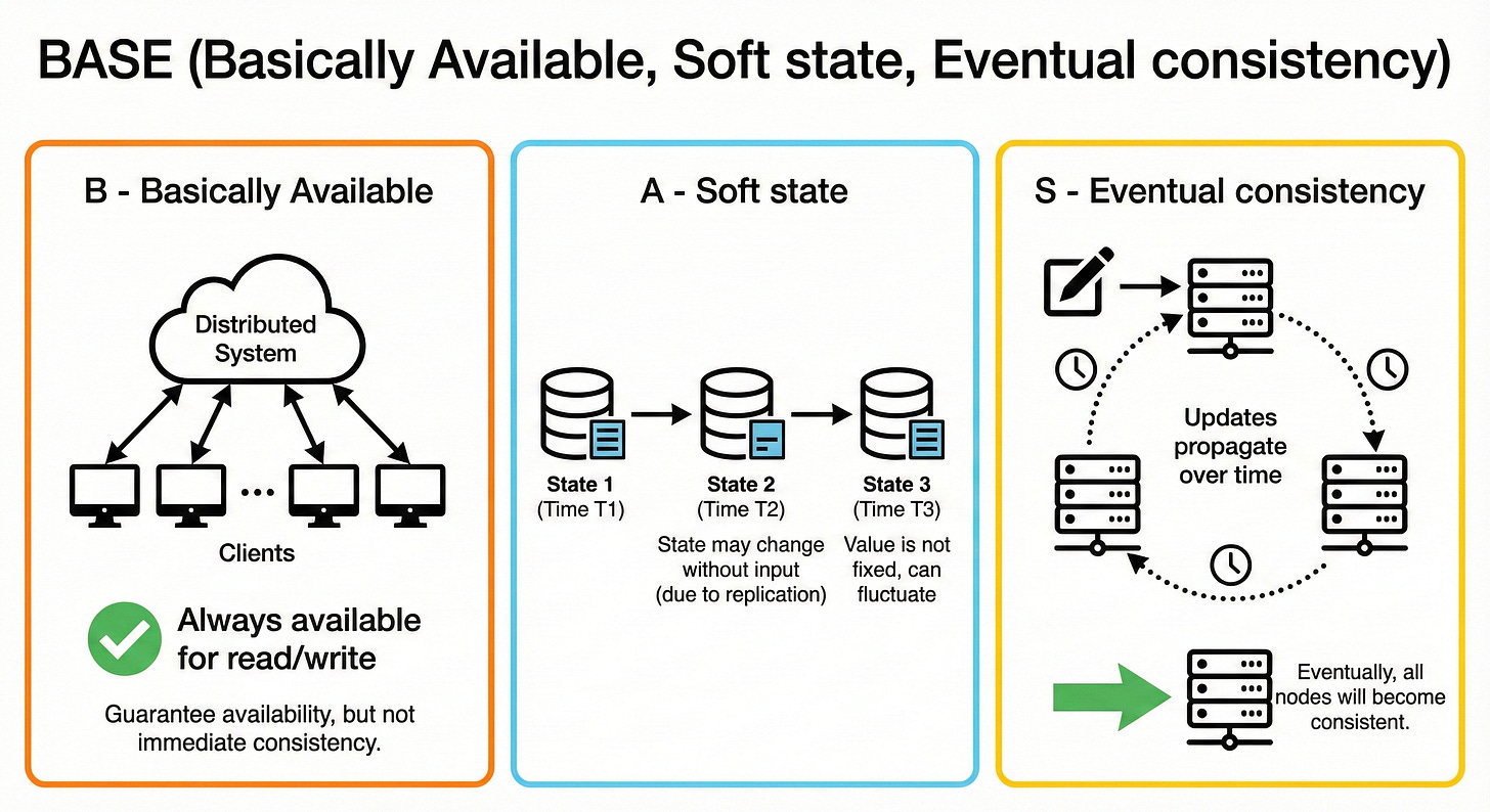 BASE is for systems that need massive scale and speed (Social Media). It focuses on Basically Available, Soft state, and Eventual consistency.