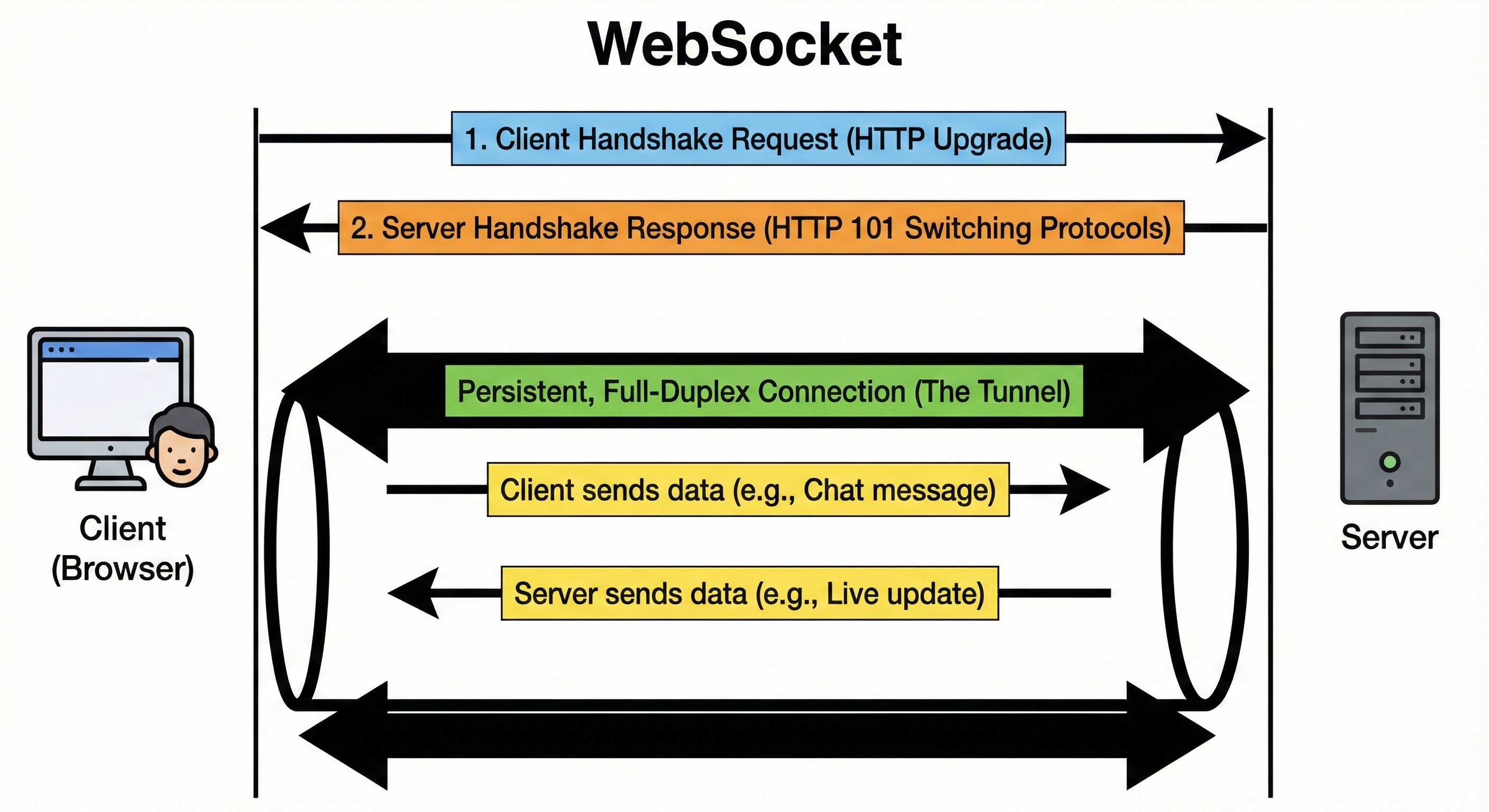 How it works: The connection starts as a standard HTTP request. The client sends a request with a special header asking to “upgrade” the connection. If the server agrees, the protocol switches from HTTP to WebSocket.
