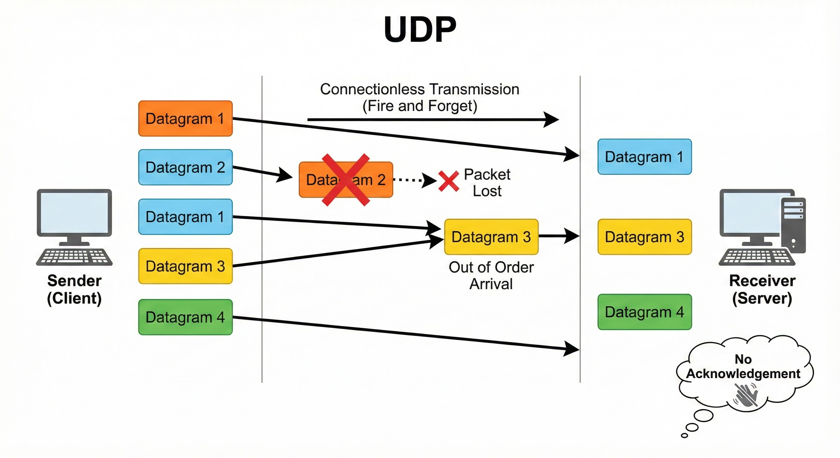 UDP does not perform a handshake. It does not number the packets to ensure they are in order. It does not check if the data arrived safely. It simply sends the data out and hopes for the best.