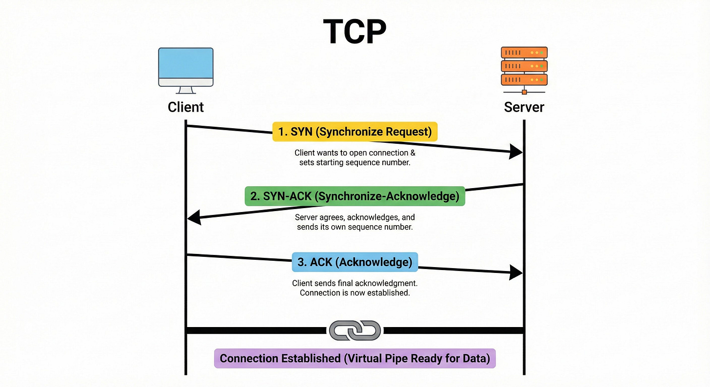 How it works: TCP creates a connection between the client and the server before any data is exchanged. This process is called the Three-Way Handshake.