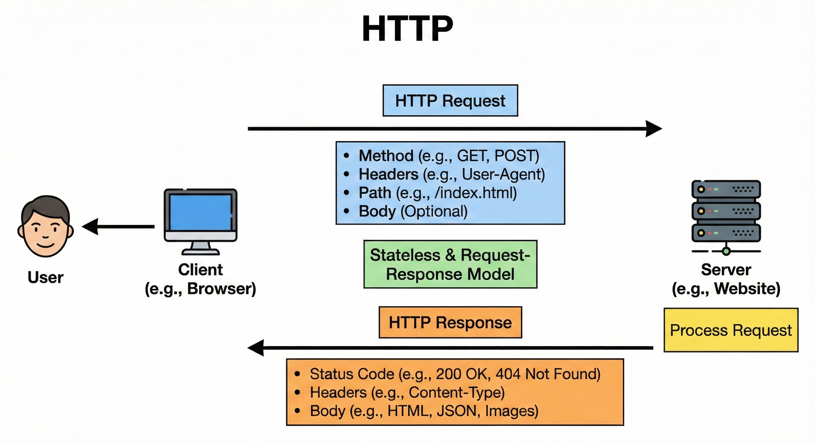 HTTP is the standard protocol for the web. It operates on a Request-Response model. The client (like a web browser) sends a request, and the server sends back a response.