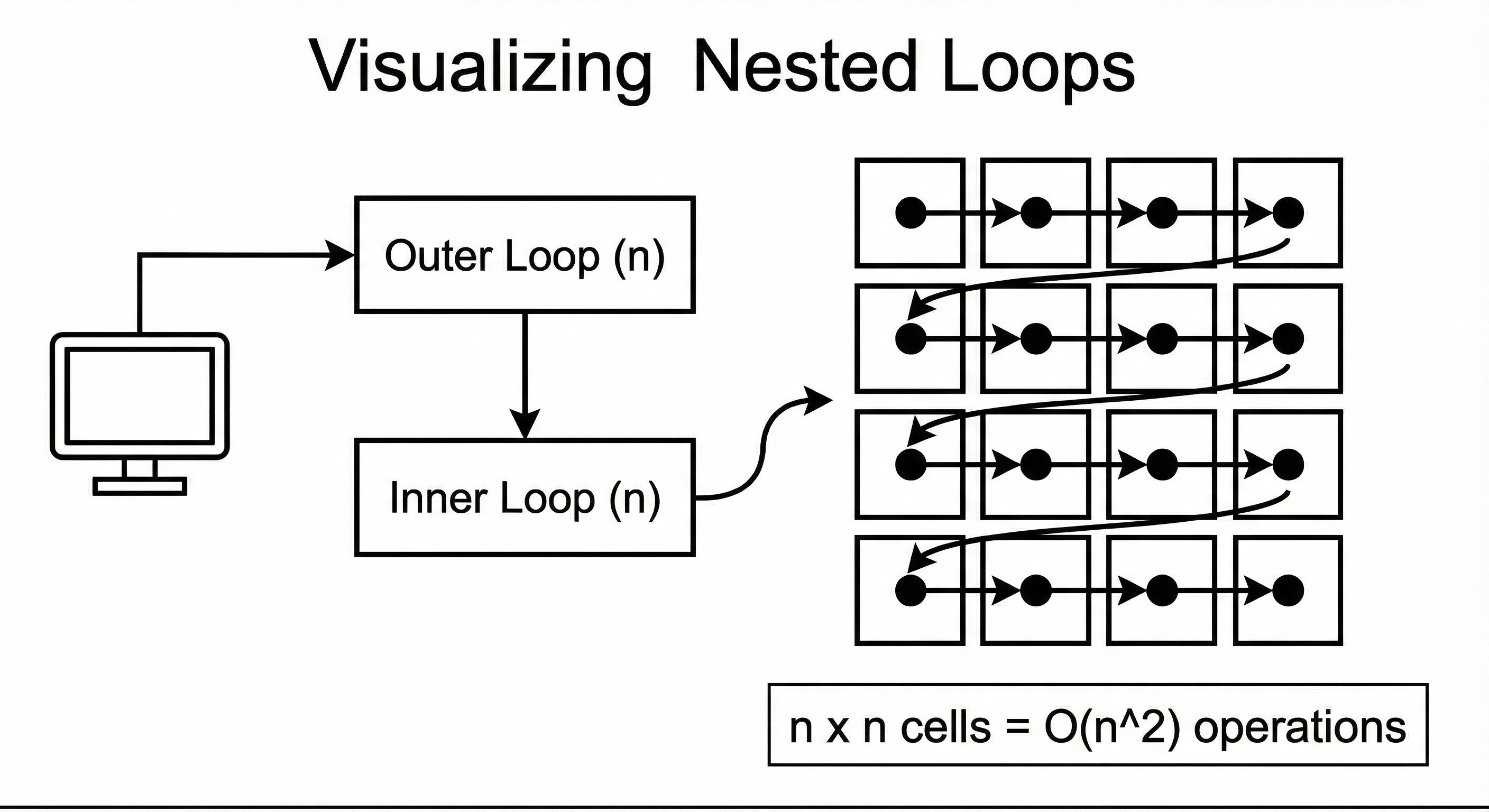 itemshas 10 elements, the outer loop runs 10 times.For each of those 10 times, the inner loop runs 10 times.