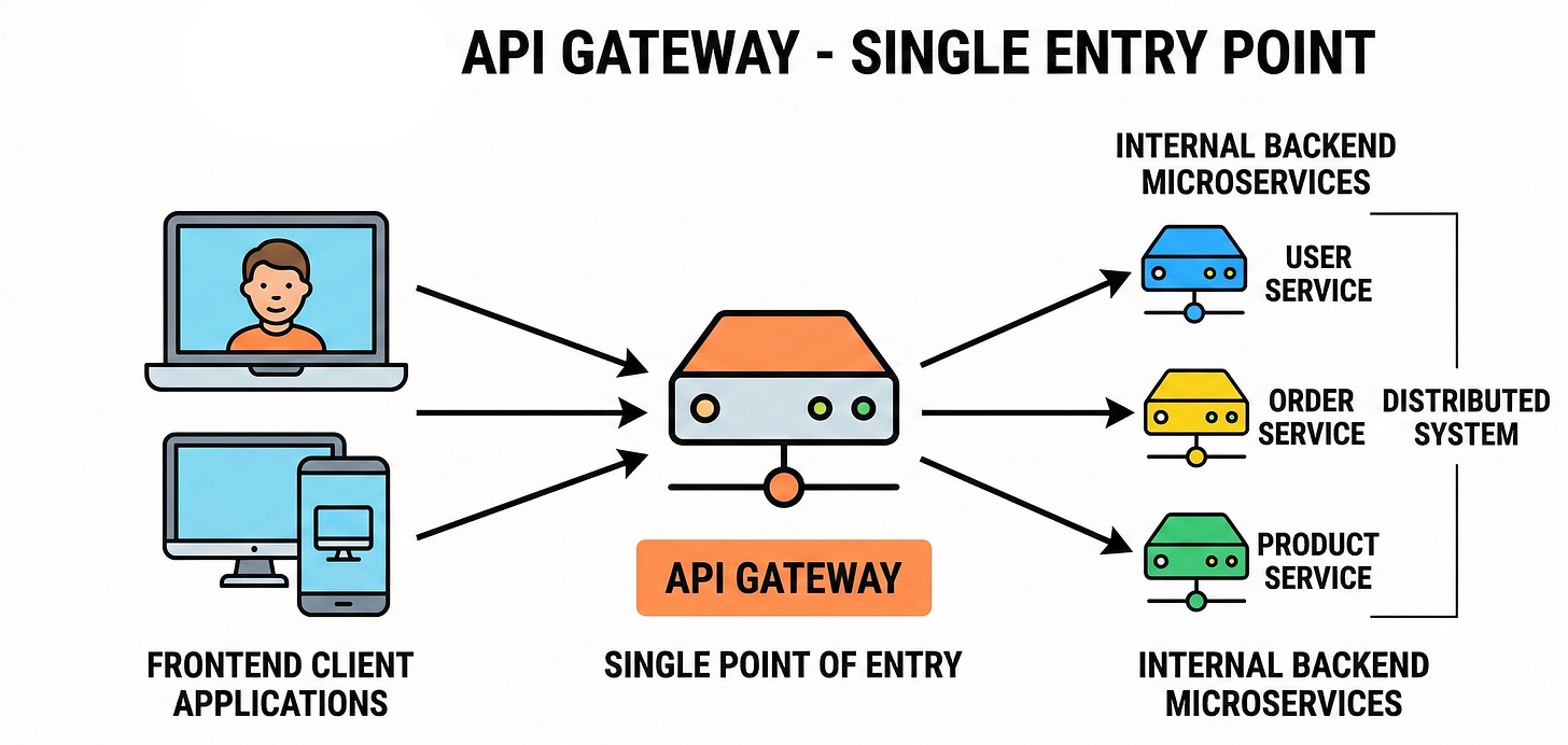 An API Gateway is a dedicated server that acts as the single point of entry for a distributed system. It sits exactly between the frontend client applications and the internal backend microservices.