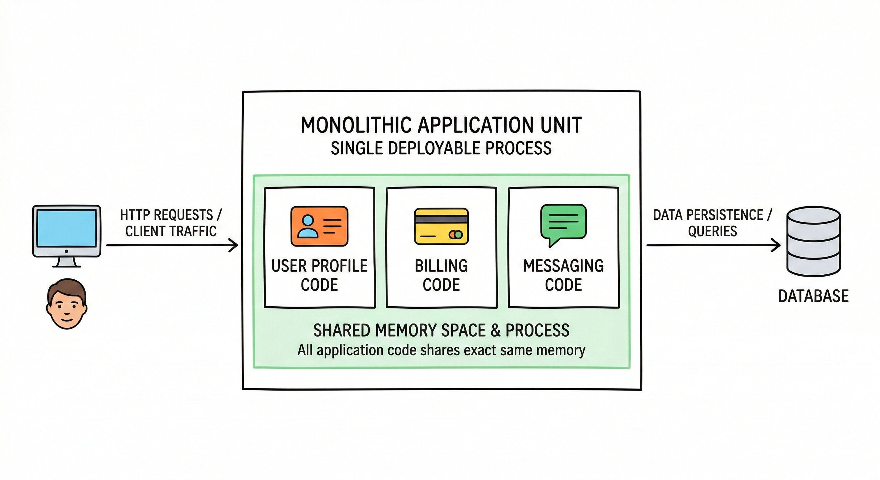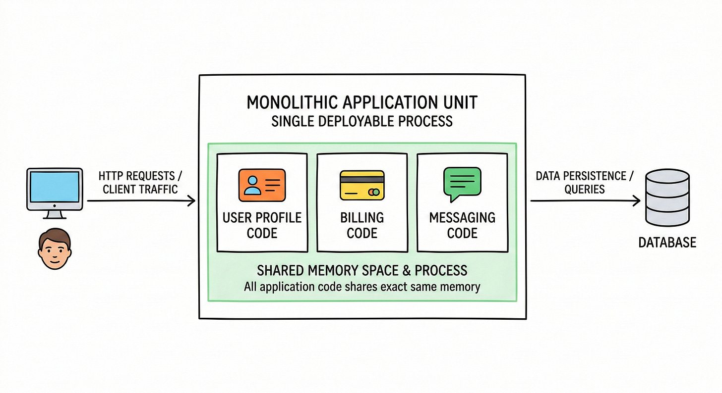 A monolith contains all application code within one single deployable unit. The user profile code, the billing code, and the messaging code all share the exact same memory space.