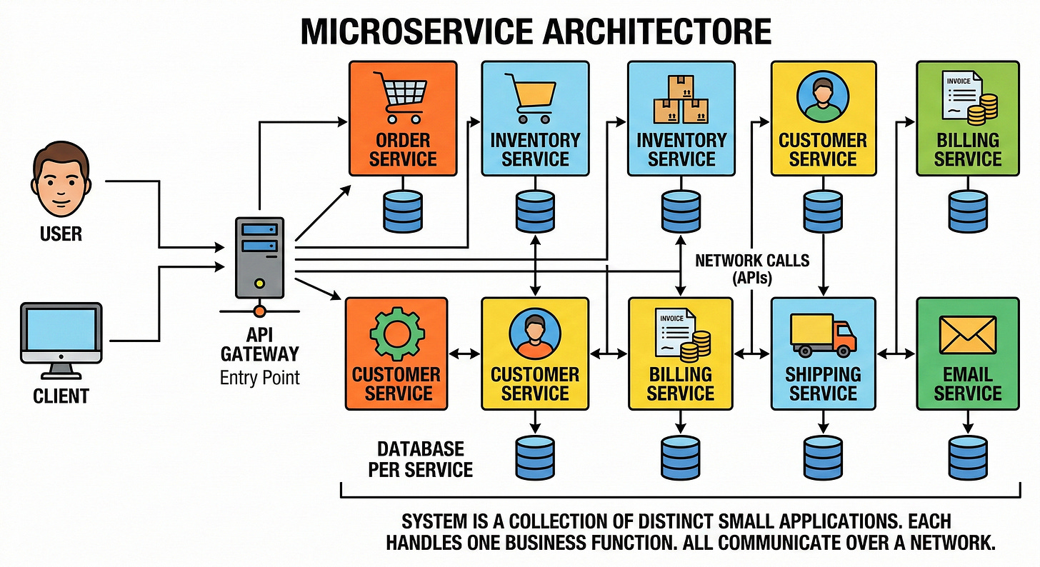 A microservice is a small standalone program that handles one specific business function. Instead of one massive application, the system becomes a collection of fifty small applications. These small applications communicate with each other over a network.