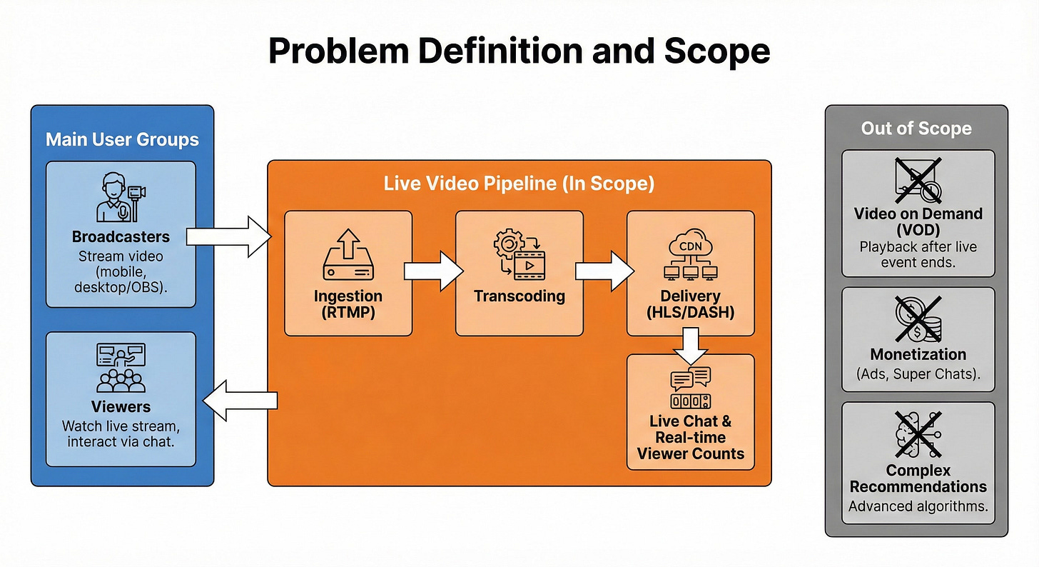 Step-by-step system design walkthrough for a live streaming platform like Twitch/YouTube Live. Covers ingest (RTMP), transcoding, HLS delivery, chat, CDN, scaling, and reliability patterns.