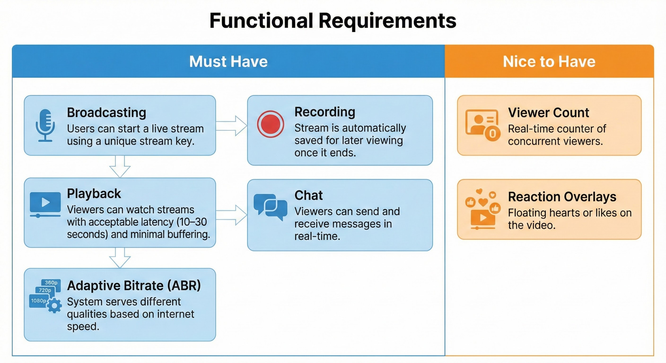 Playback: Viewers can watch streams with acceptable latency (10–30 seconds) and minimal buffering.