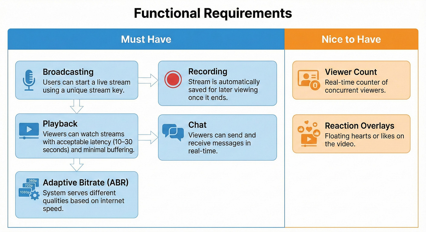 We are designing a large-scale live streaming platform where users can broadcast video in real-time to a global audience. The system needs to handle video ingestion from content creators, process that video into different formats, and deliver it efficiently to millions of viewers.