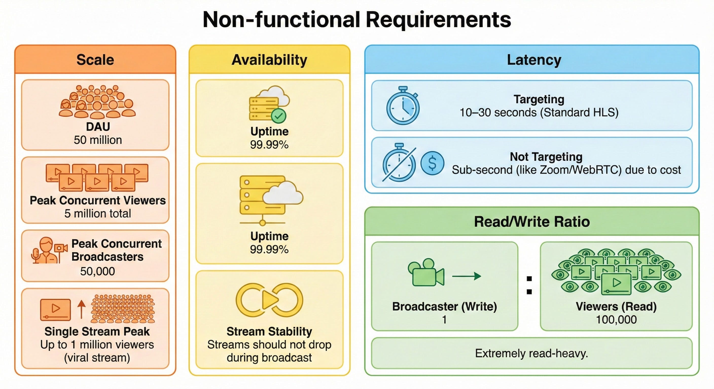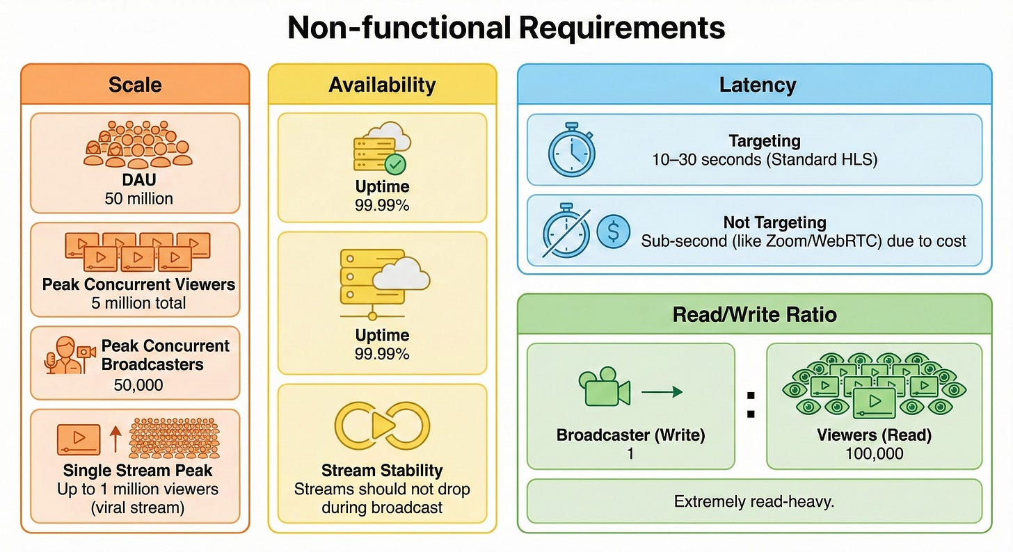 Read/Write Ratio: Extremely read-heavy. (1 broadcaster writes : 100,000 viewers read).