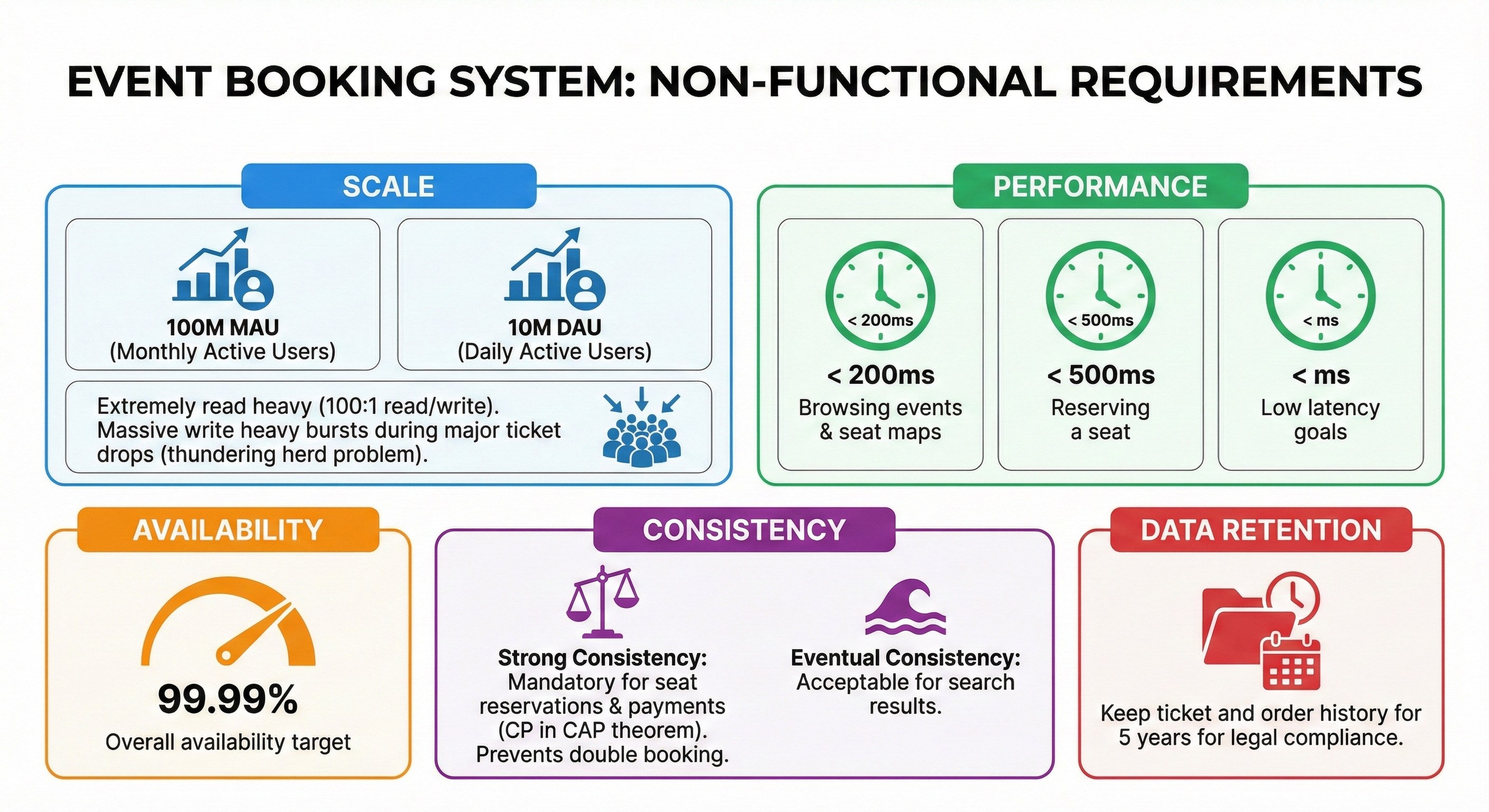 Consistency preference: Strong consistency is absolutely mandatory for seat reservations and payments to prevent double booking. We favor Consistency over Availability (CP in the CAP theorem) during checkout. Eventual consistency is acceptable for search results.