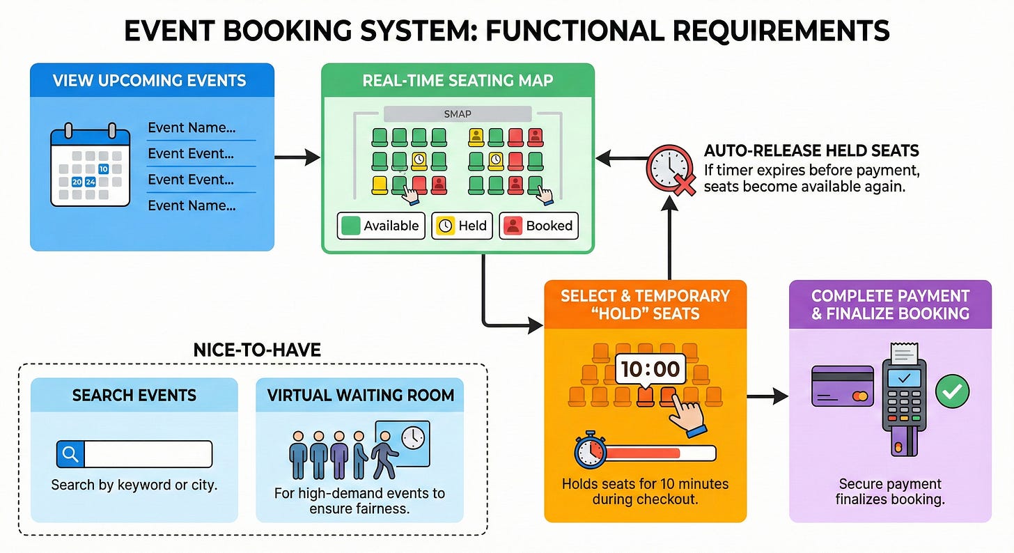Because this is a massive system, we will focus strictly on the customer booking flow: browsing events, viewing seat maps, temporarily reserving seats, and completing the purchase.