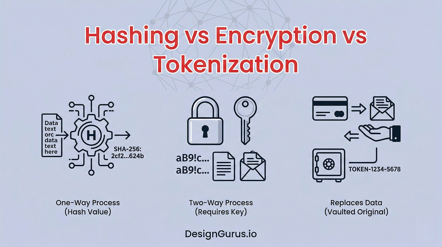 Hashing, encryption, and tokenization all protect data differently. Learn how each one works, what makes them unique, and when to use which in system design.