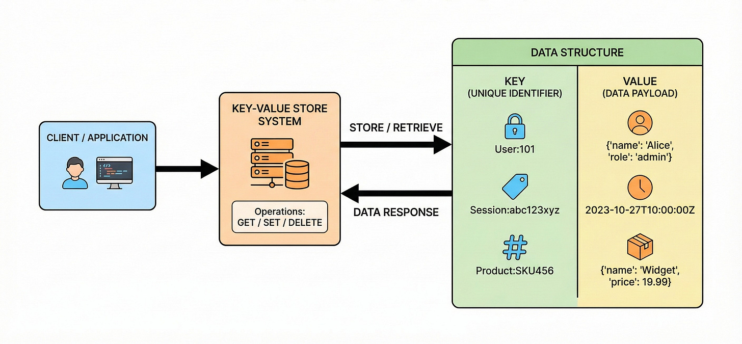 This is the simplest form of database. It functions exactly like a dictionary or hash map in programming. Every data item consists of a key and a value.