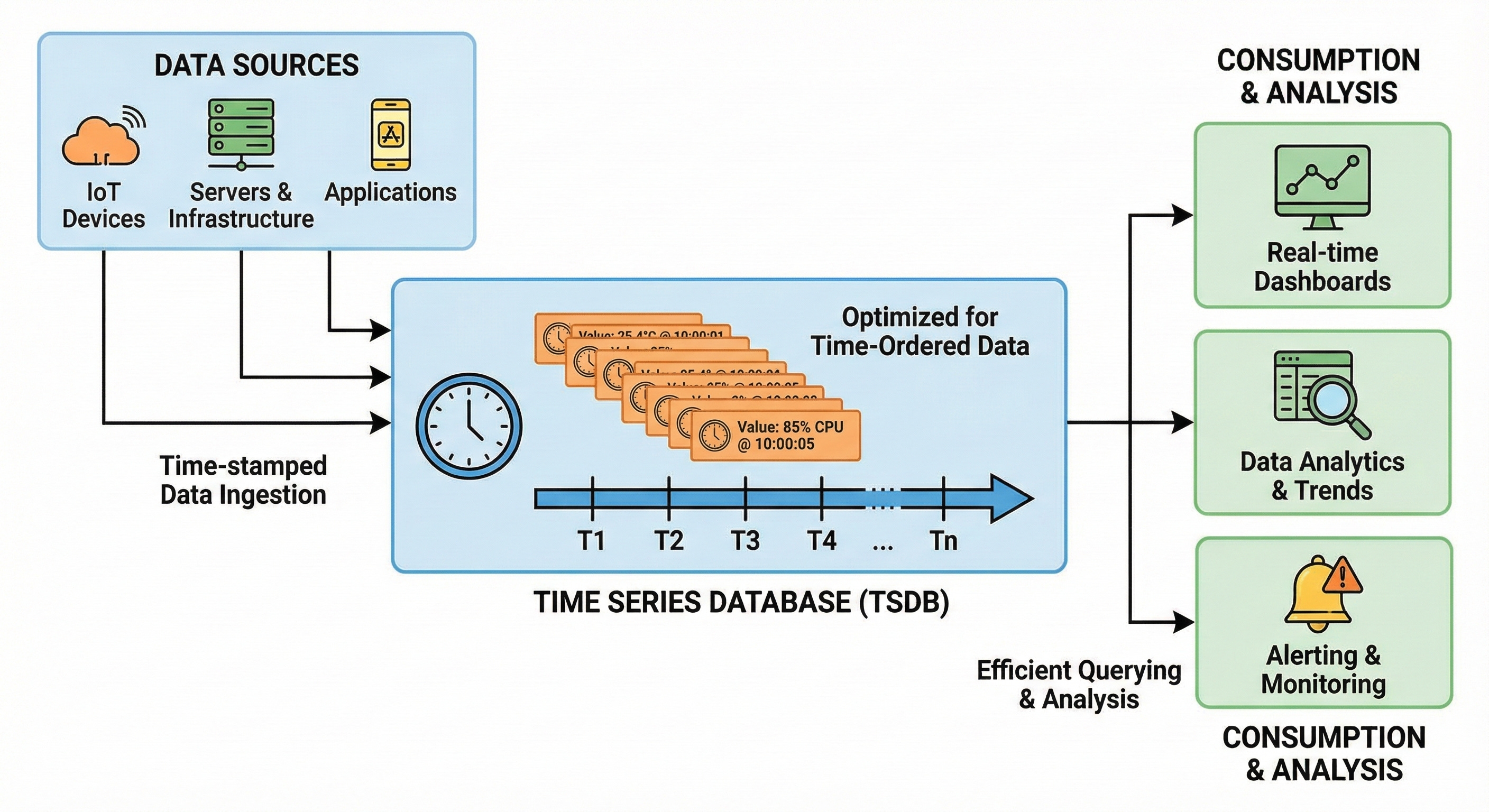 Unlike standard databases that might overwrite old values, a TSDB appends new values with a timestamp. This allows for efficient compression and analysis of trends over time.