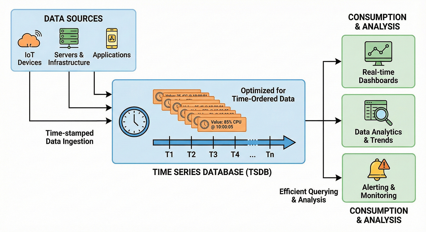 Time-Series Databases (TSDB) are optimized to handle this specific pattern.
