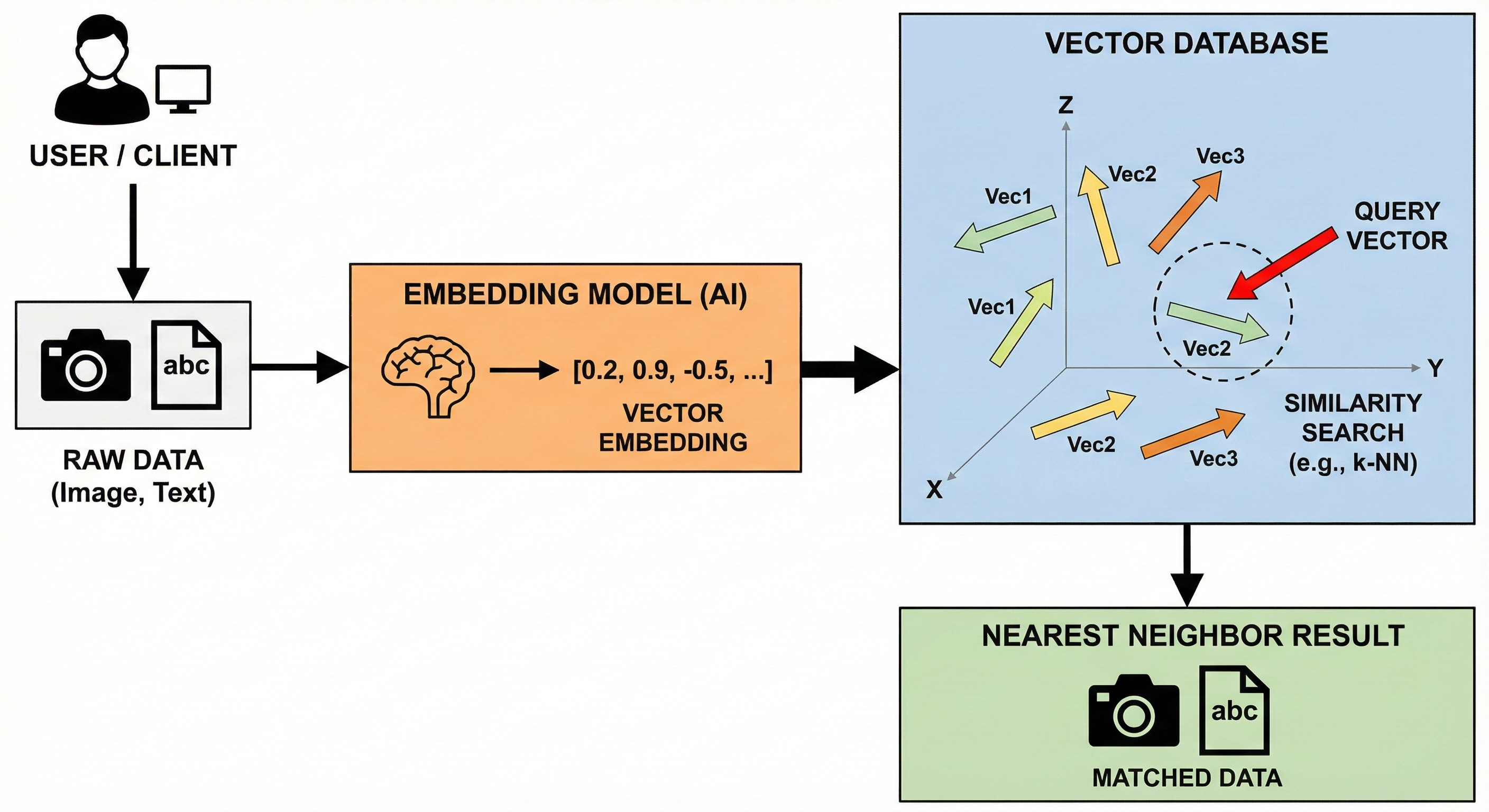 The core function of a vector database is not exact matching, but “similarity search.” When a query enters the system, it is converted into a vector.