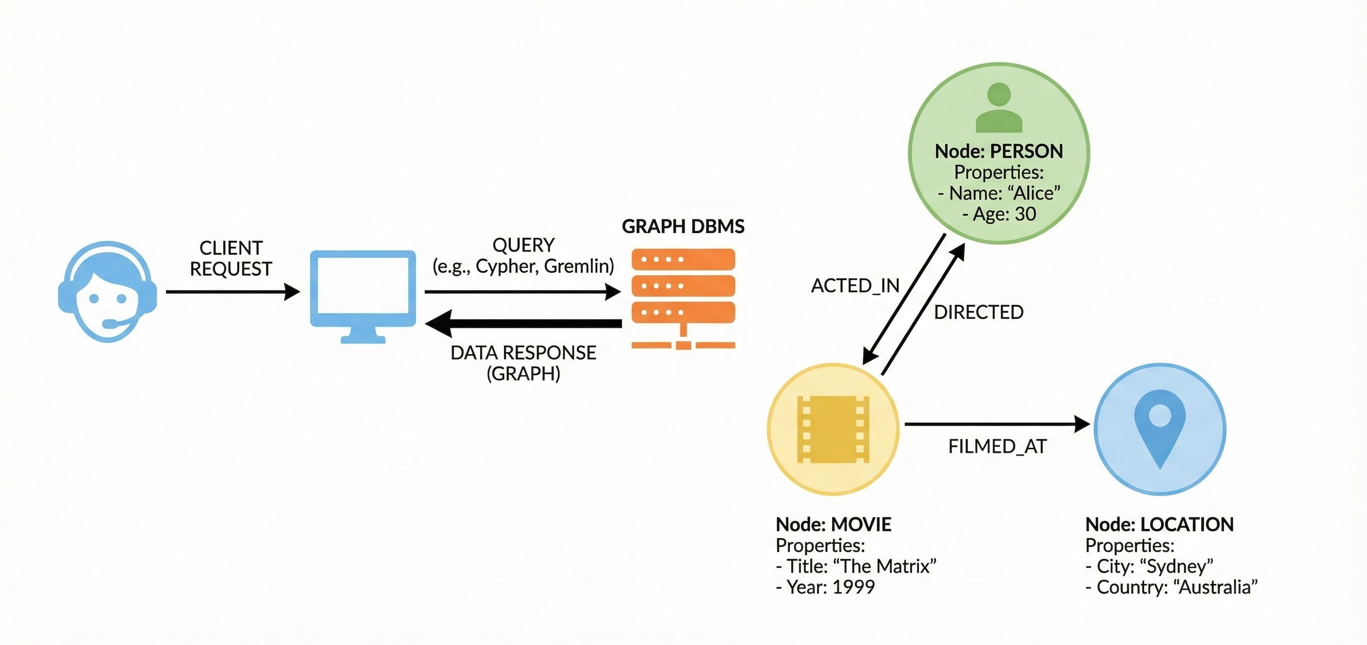 Graph databases treat the relationship itself as a first-class citizen. They consist of nodes (entities) and edges (relationships). Both nodes and edges can hold properties.