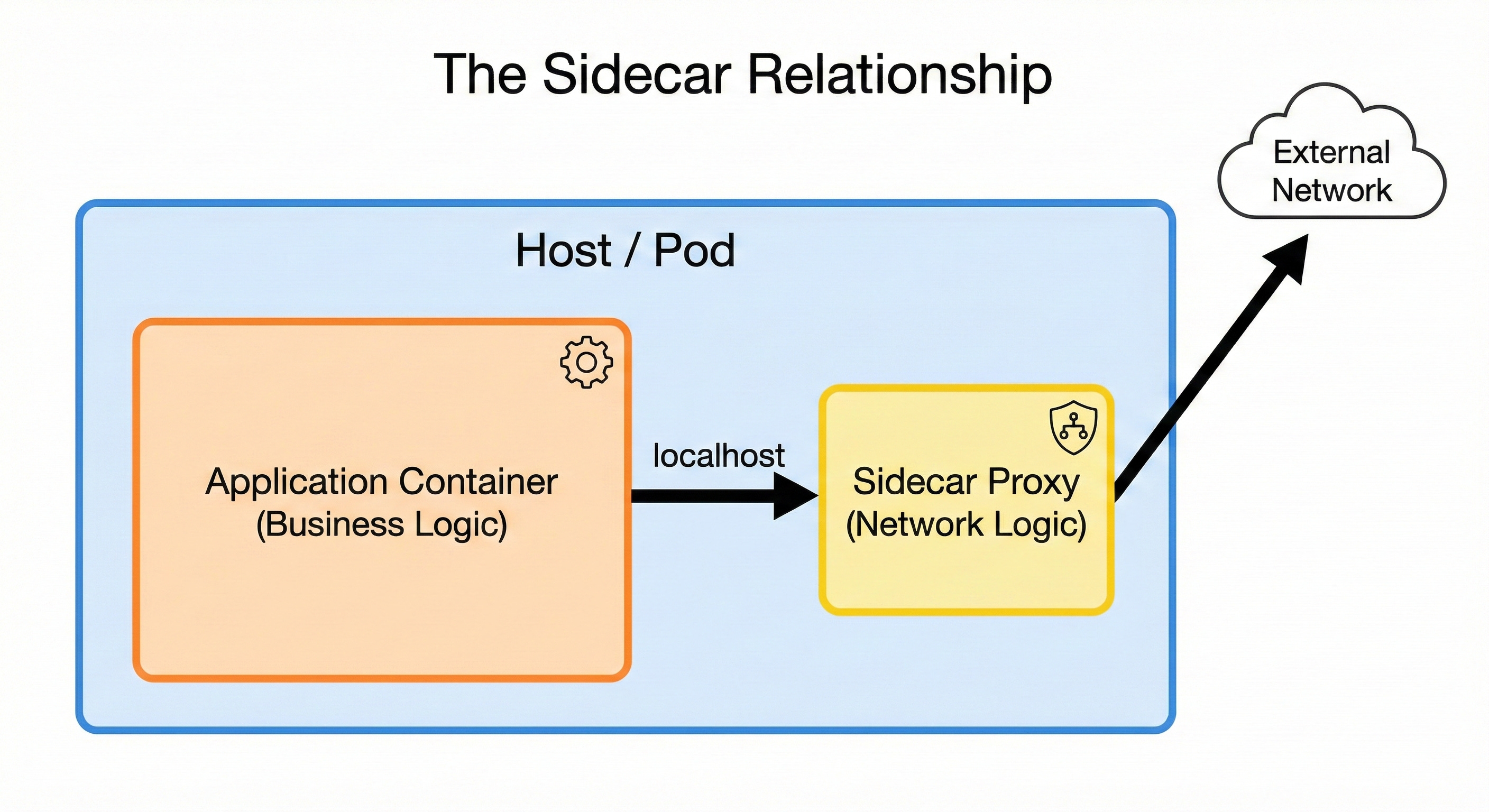 The relationship between the main application and the sidecar is strict but simple. The application is stripped of all complex networking code. It only contains business logic.