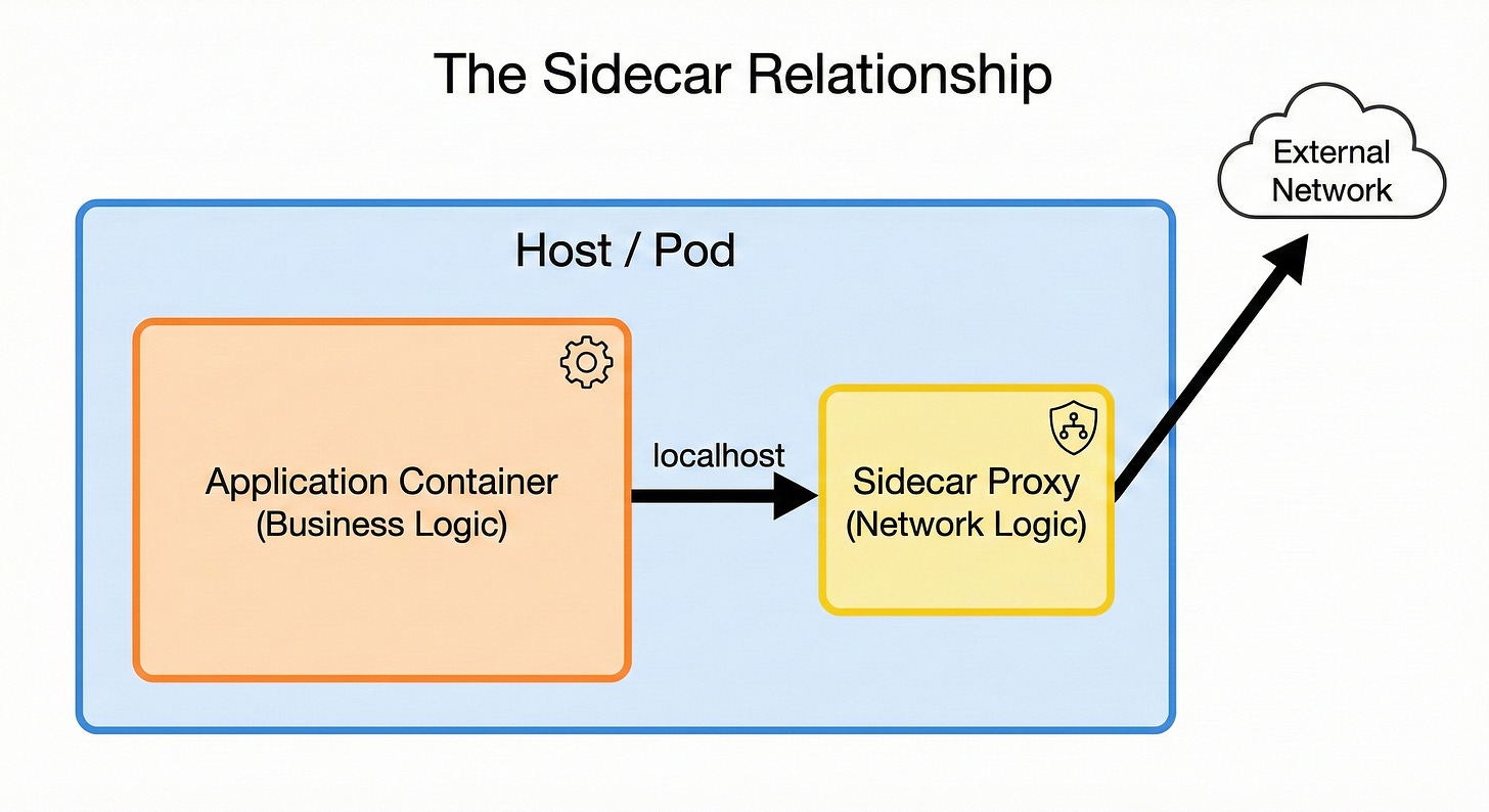 The industry solved this coupling problem by moving the networking logic out of the application and into a separate, dedicated process. This architecture is known as the Sidecar Pattern.