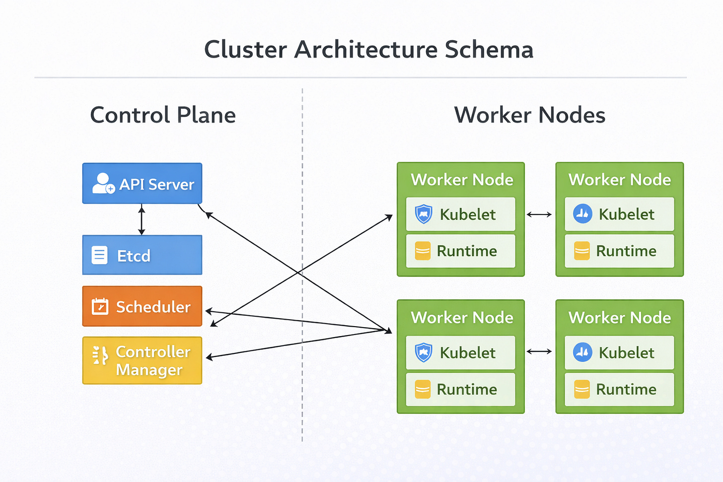 The cluster hierarchy is divided into two strict functional areas: the Control Plane and the Worker Nodes.