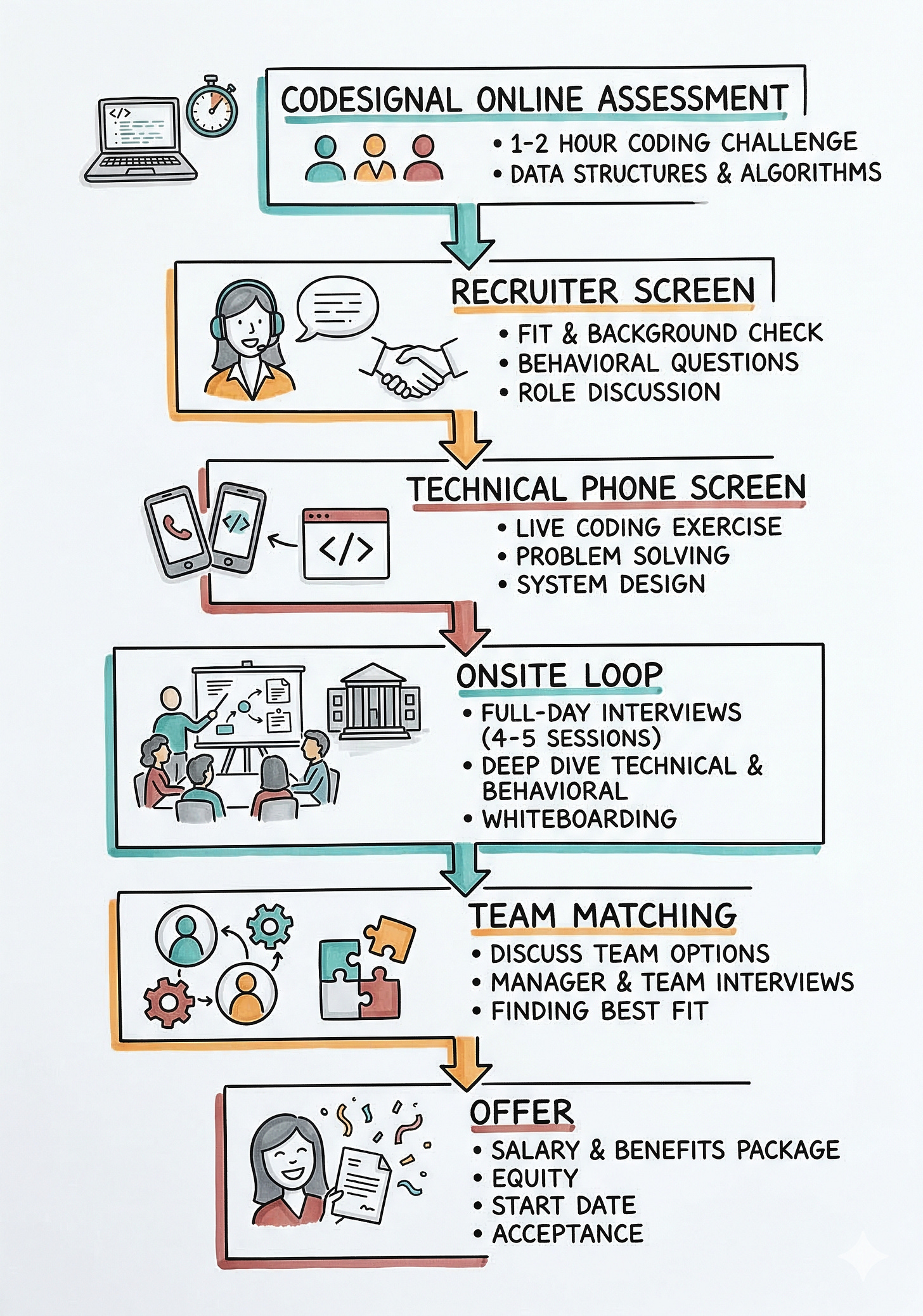 Meta’s software engineering interview pipeline follows a well-defined sequence: CodeSignal online assessment → recruiter screen → technical phone screen → onsite loop → team matching → offer.