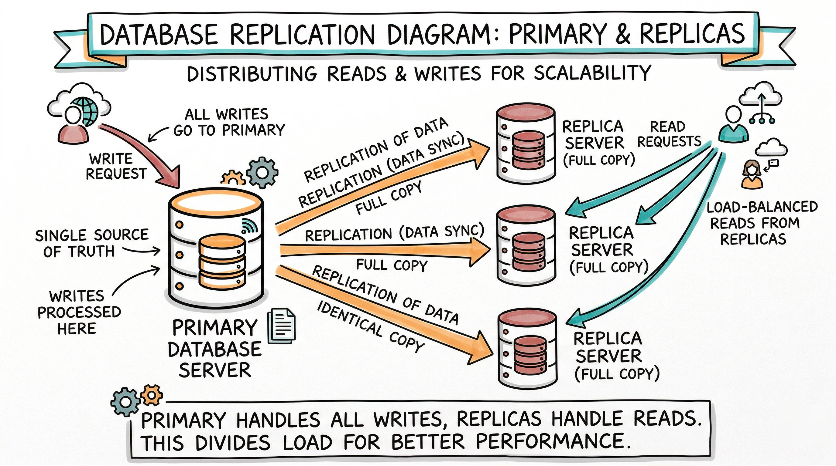 1. Read scalability. If your application does way more reading than writing (which is true for most apps), you can spread those read requests across all the replicas. Instead of one server handling 10,000 read queries per second, you now have five servers each handling 2,000. The load is distributed.
