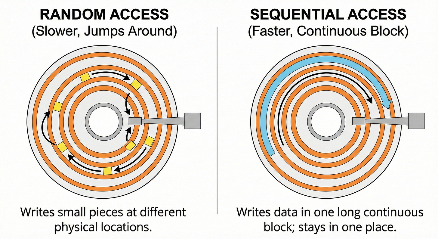 This jumping around is incredibly slow because mechanical parts must physically move across the disk. Even on modern solid state drives, random access requires the hardware to constantly update scattered storage blocks.