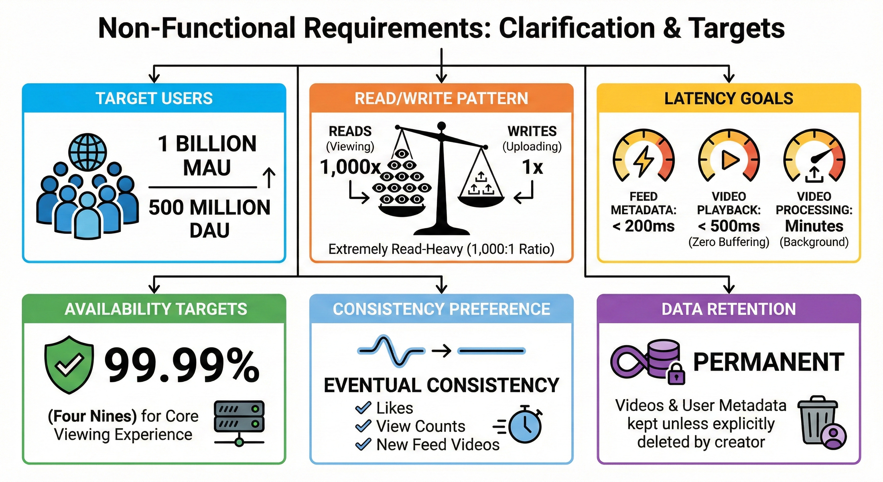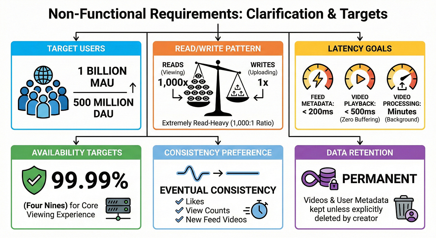 Latency goals: Feed metadata must load in under 200ms. Video playback must start in under 500ms (zero buffering). Video uploads can take a few minutes to process in the background.