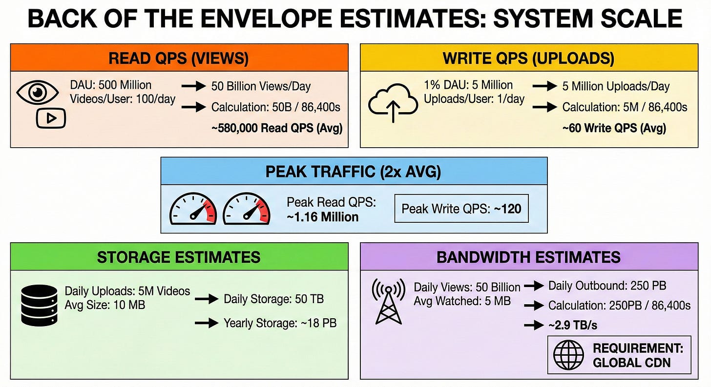 Read and write pattern: Extremely read-heavy. Users watch hundreds of videos for every single video uploaded. We will assume a read-to-write ratio of roughly 1,000:1.