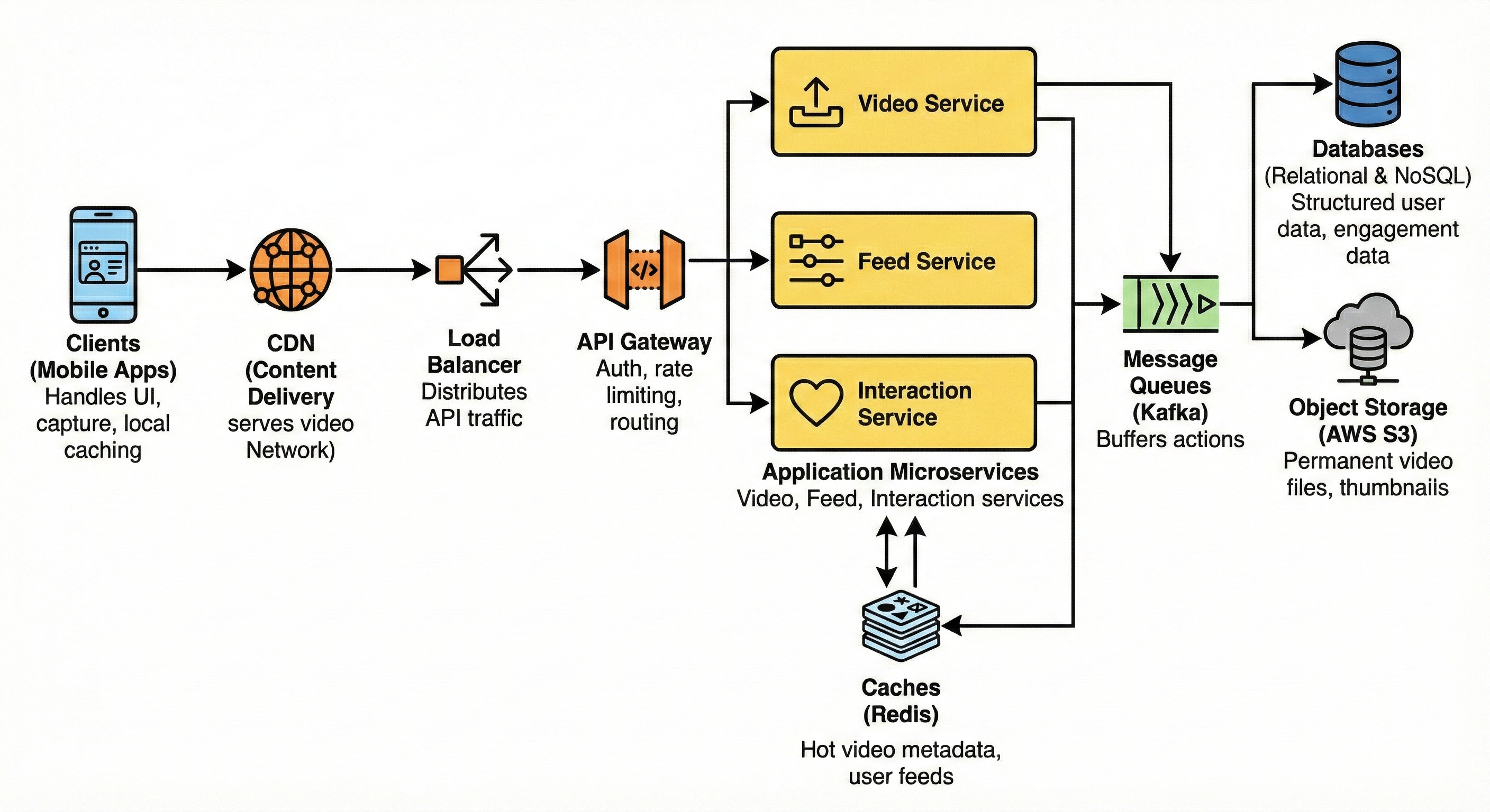 Clients (Mobile Apps): Handles the UI, video capture, and local caching of upcoming videos for smooth swiping.