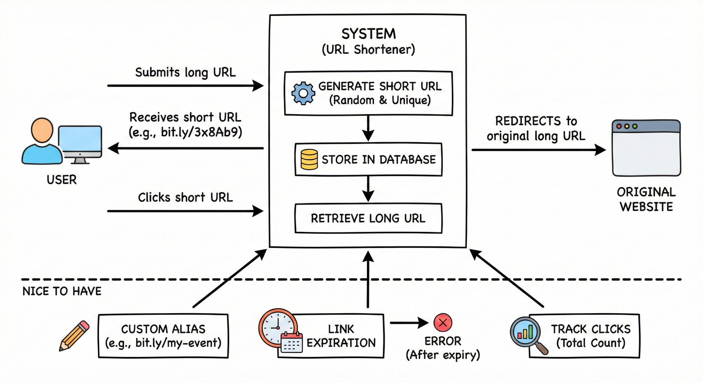 For this design, we will focus strictly on the core flows: generating the short link, reliably redirecting users to the original long URL, and tracking basic click counts.