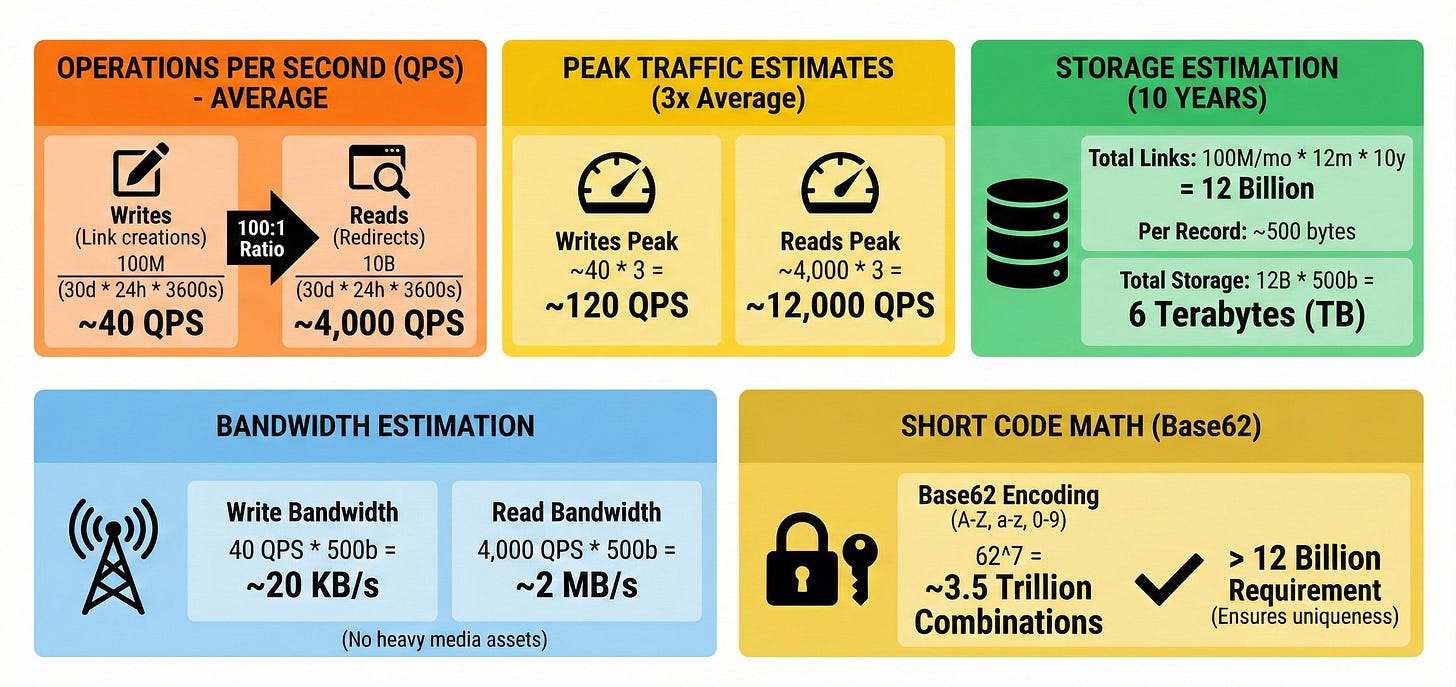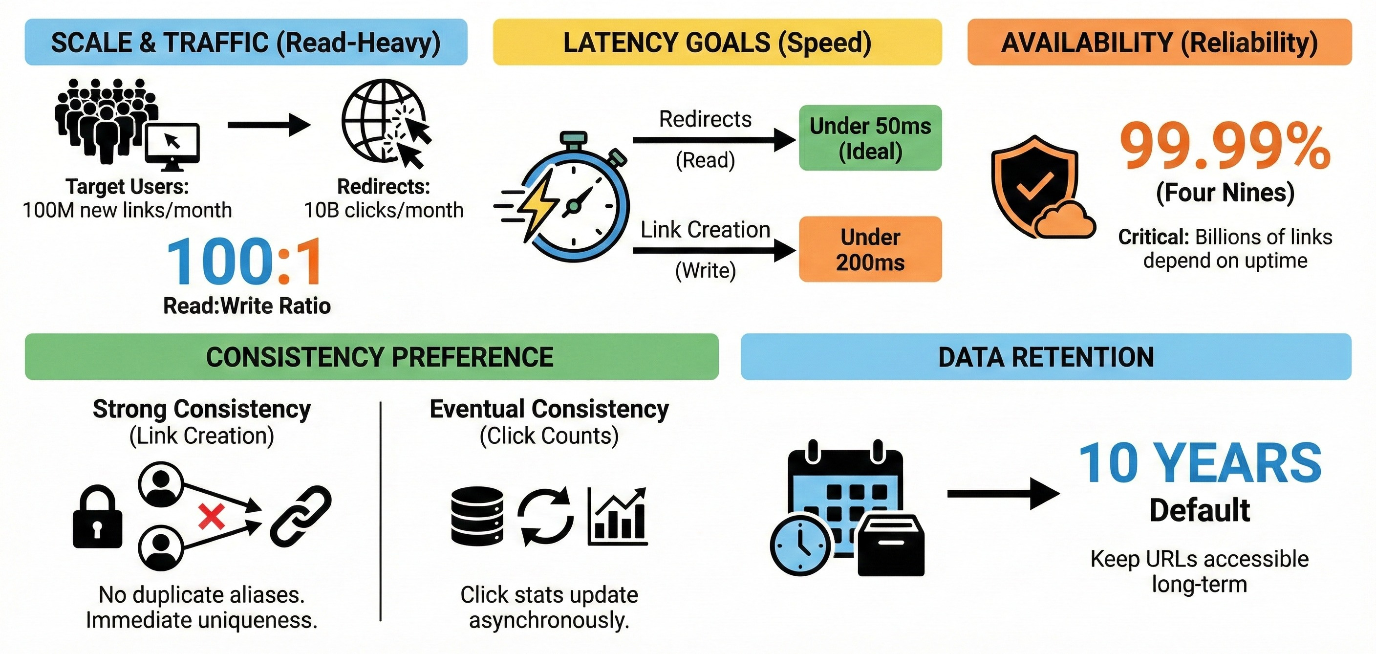 Latency goals: Read requests (redirects) must be incredibly fast, ideally under 50ms, so the user does not notice the middleman. Writes (creating a link) should be under 200ms.