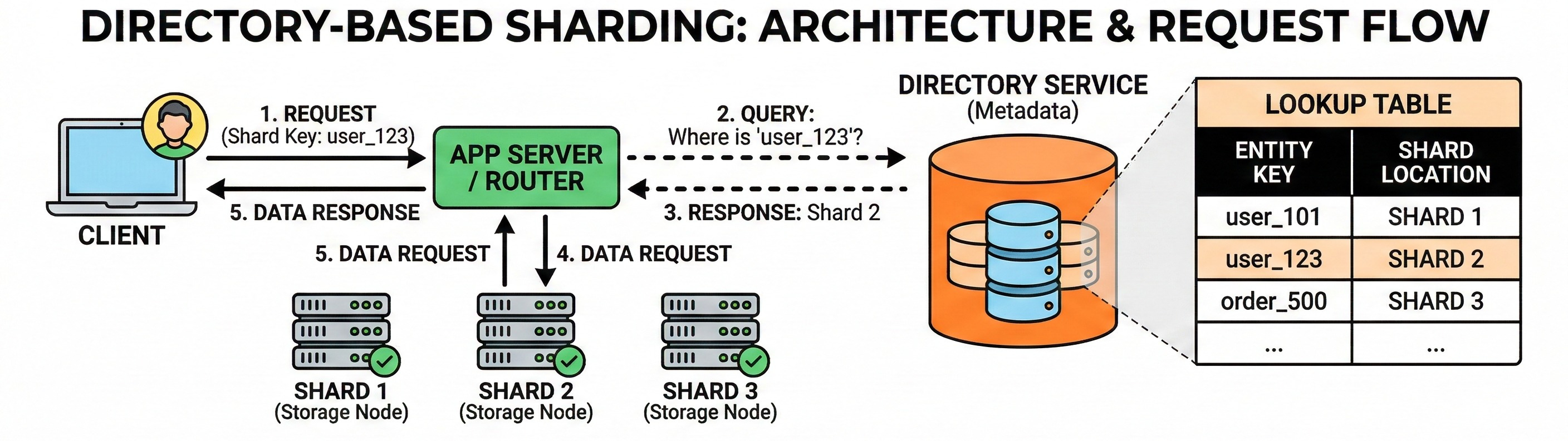 Directory-based sharding uses a lookup structure that maps a key to a shard.