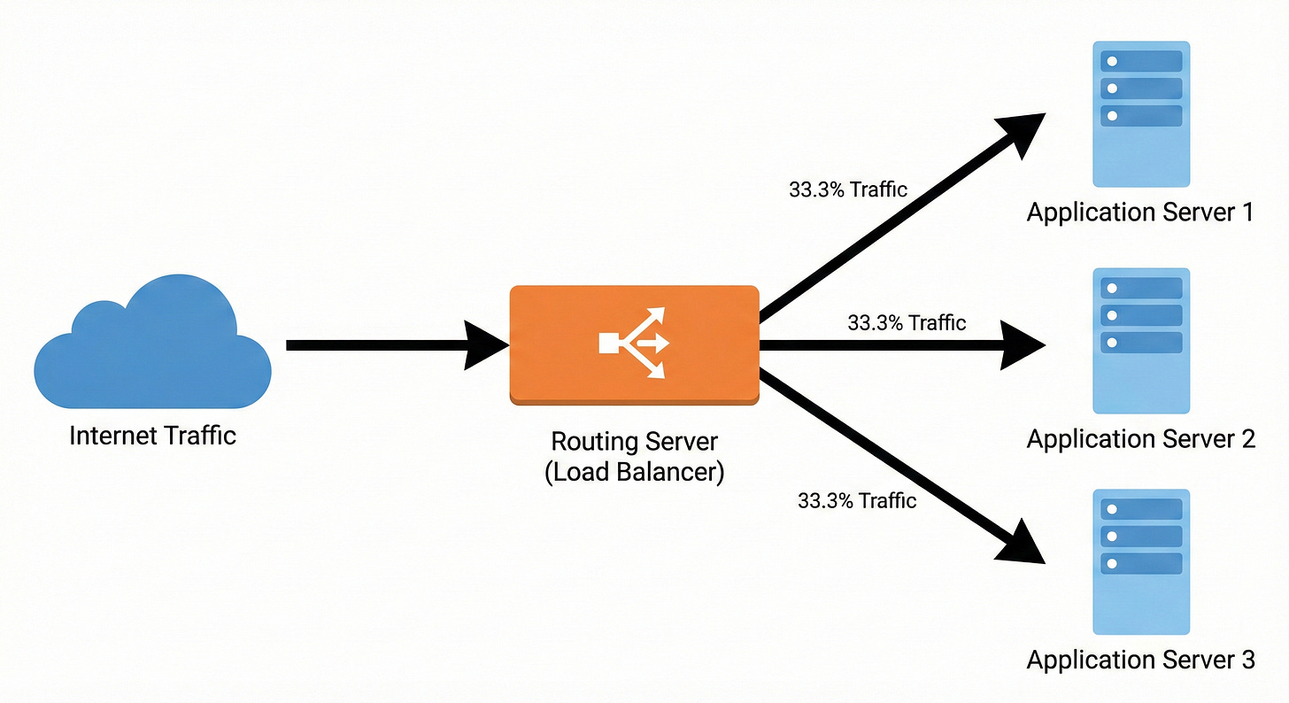 A load balancer is a server that sits directly in front of the web servers. All incoming internet traffic hits this routing server first before reaching the application.