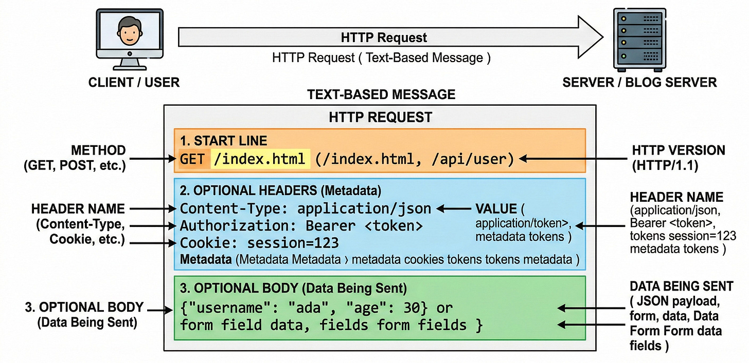 An HTTP request is a text-based message that tells the server what the client wants. It consists of a start line (with a method like GET or POST and the requested path), optional headers (metadata like content type, authentication tokens, cookies), and an optional body (data being sent, such as form fields).