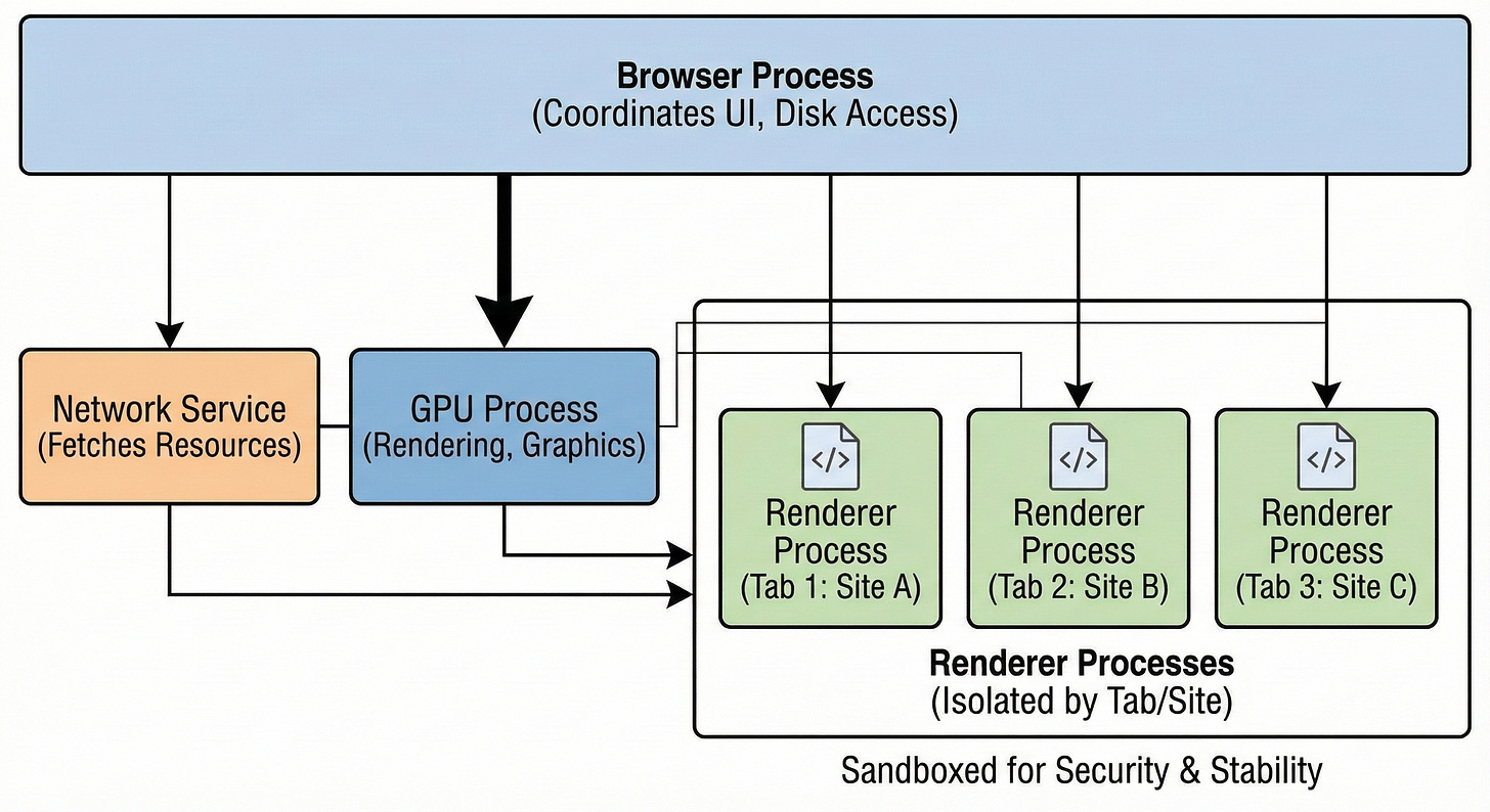 Multi-process architecture ensures stability: Browsers separate the application state, rendering logic, and GPU operations into distinct processes so that a crash in one tab does not bring down the entire application.