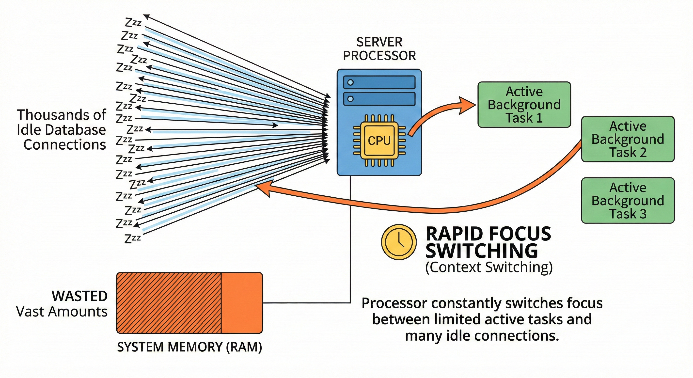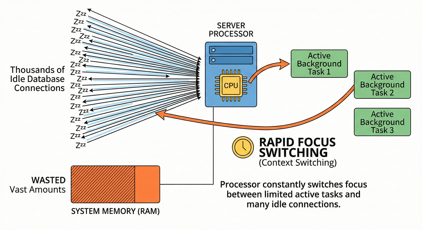 A computer processor can only handle a specific number of background tasks simultaneously. Managing many open database connections forces the processor to rapidly switch its focus.